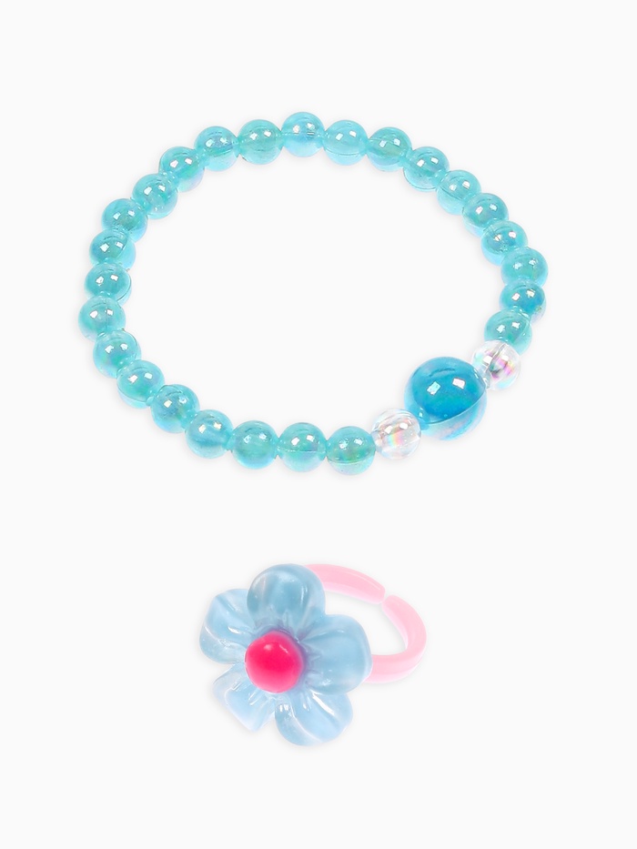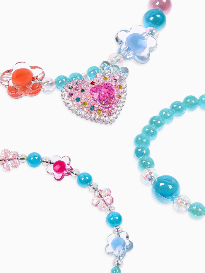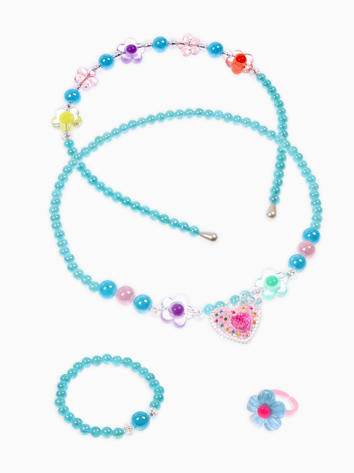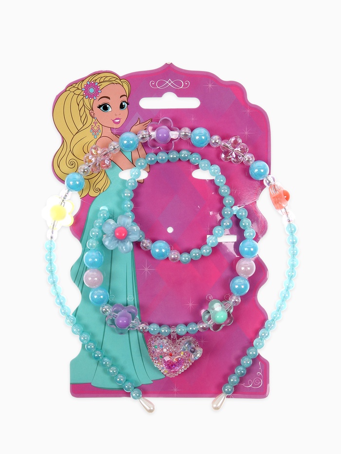 Набор включает четыре стильных элемента: клипсы, бусы, кольцо и ободок, выполненные в миксованных цветах, позволяющих сочетать разные оттенки и создавать самые оригинальные образы. Каждый элемент изготовлен из лёгкого и безопасного пластика, соответствующего стандартам экологичности и качества. Такое исполнение облегчает уход за украшениями и делает их безопасными для детской кожи.