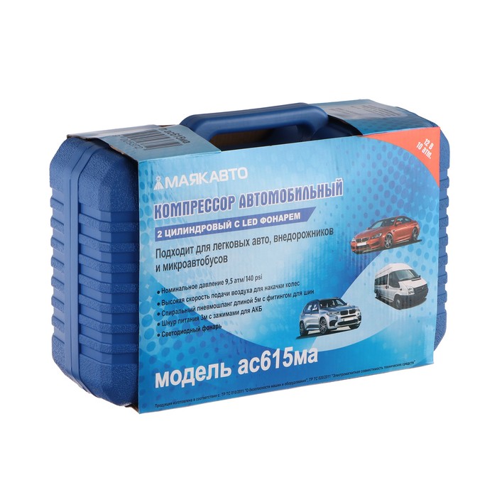 Технические характеристики Компрессор автомобильный МАЯКАВТО АС-615ма, двухпоршневой, усиленный, с LED-фонарем, кейс