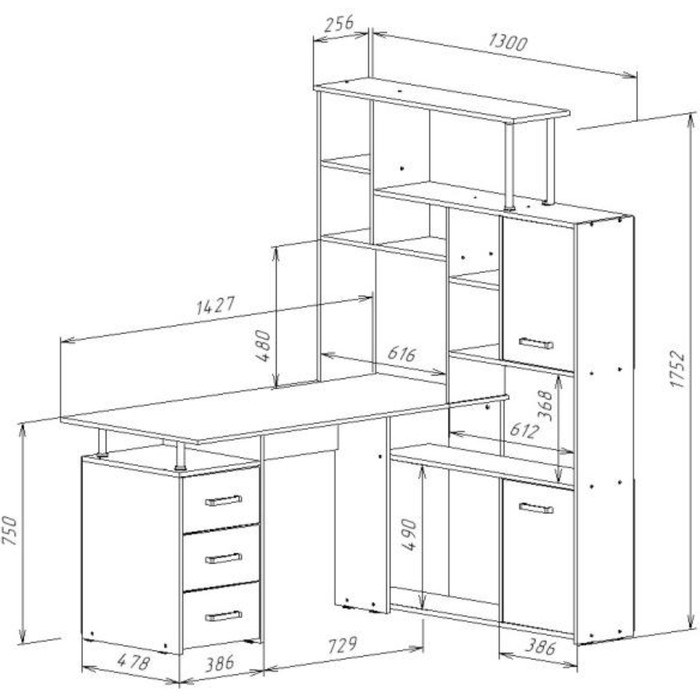 Компьютерный стол КС-15 - все самое необходимое для комфортного рабочего места. Комплектация представлена из: письменного стола с тумбой с выдвижными ящиками, двух шкафчиков, где можно хранить все самое необходимое под рукой, и надстройки с полками для книг и предметов декора. Каркас и фасад выполнен из ЛДСП. На столешнице без труда можно разместить компьютер и предметы для учебы. Полки уже встроены в конструкцию надстройки, что позволяет не сверлить стены.