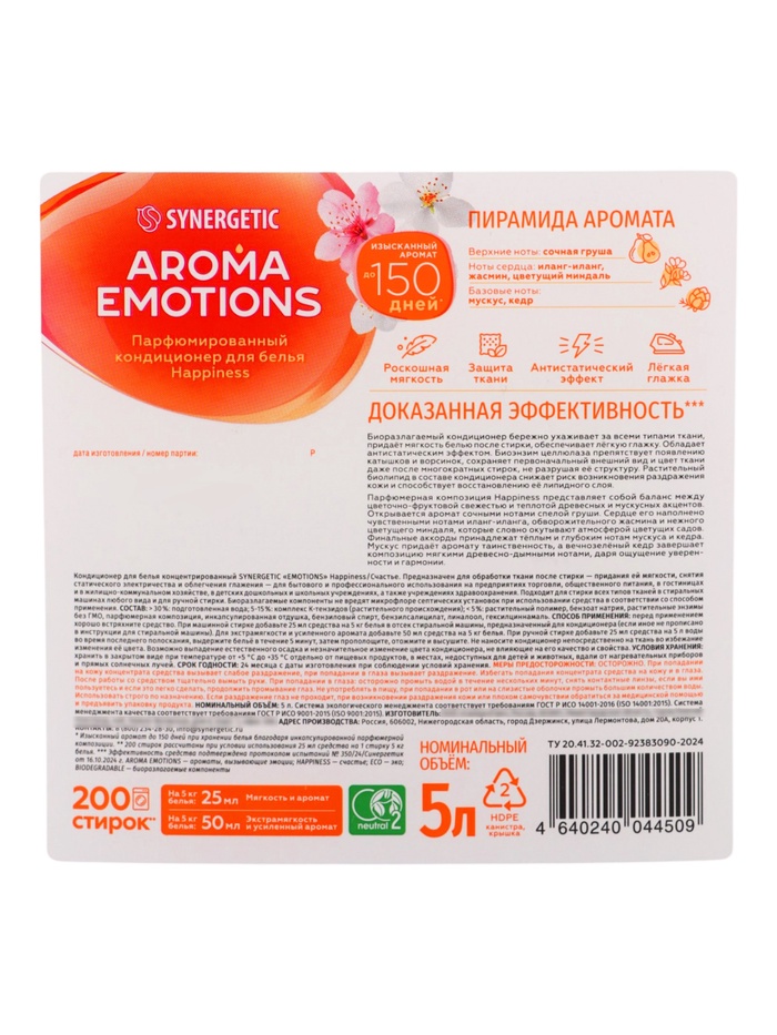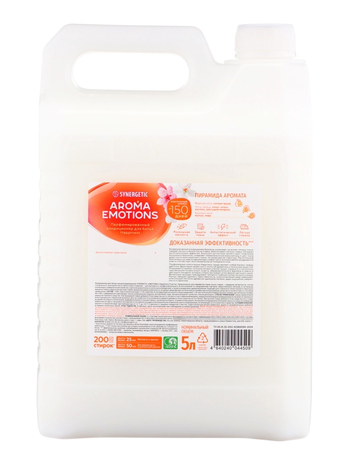 Парфюмированный кондиционер для белья SYNERGETIC «Миндаль, Груша, Жасмин», 5 л — это эффективное и безопасное средство, которое делает бельё мягким, ухоженным и ароматным, заботясь о ткани, коже и окружающей среде.