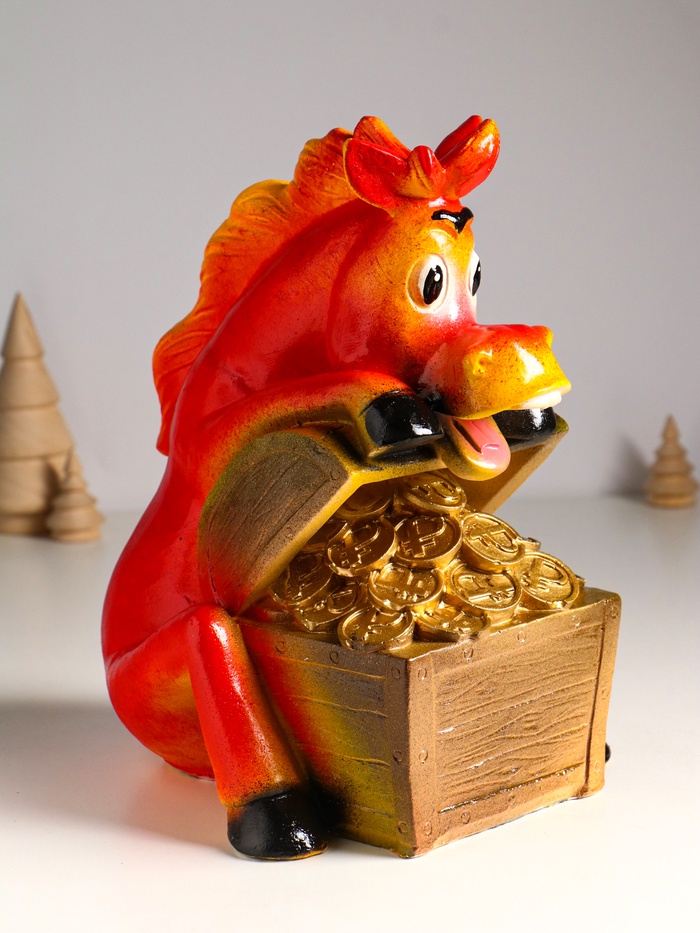 Эта фигурная копилка в виде лошади станет не просто местом для хранения сбережений, а настоящим талисманом, приносящим удачу. Образ скакуна с сундуком напоминает о движении к цели, а его яркий дизайн поднимет настроение в любом интерьере.
