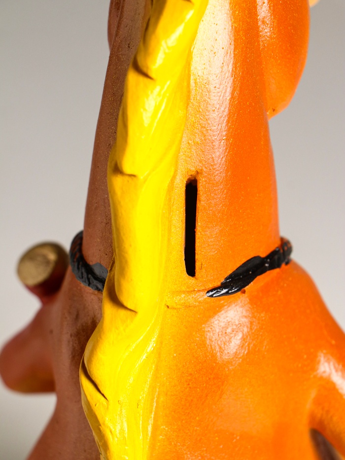- Яркое многоцветное покрытие делает копилку самостоятельным элементом декора, который оживит интерьер спальни, гостиной или кабинета.