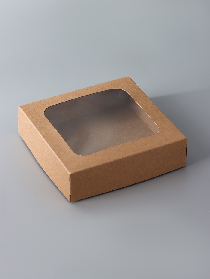 - Прозрачное окошко как элемент дизайна: Вставка расположена на крышке и показывает содержимое без вскрытия упаковки. Это решение подходит для магазинов и ярмарок — покупатели видят товар, а натуральный крафт создает образ эко-продукции.