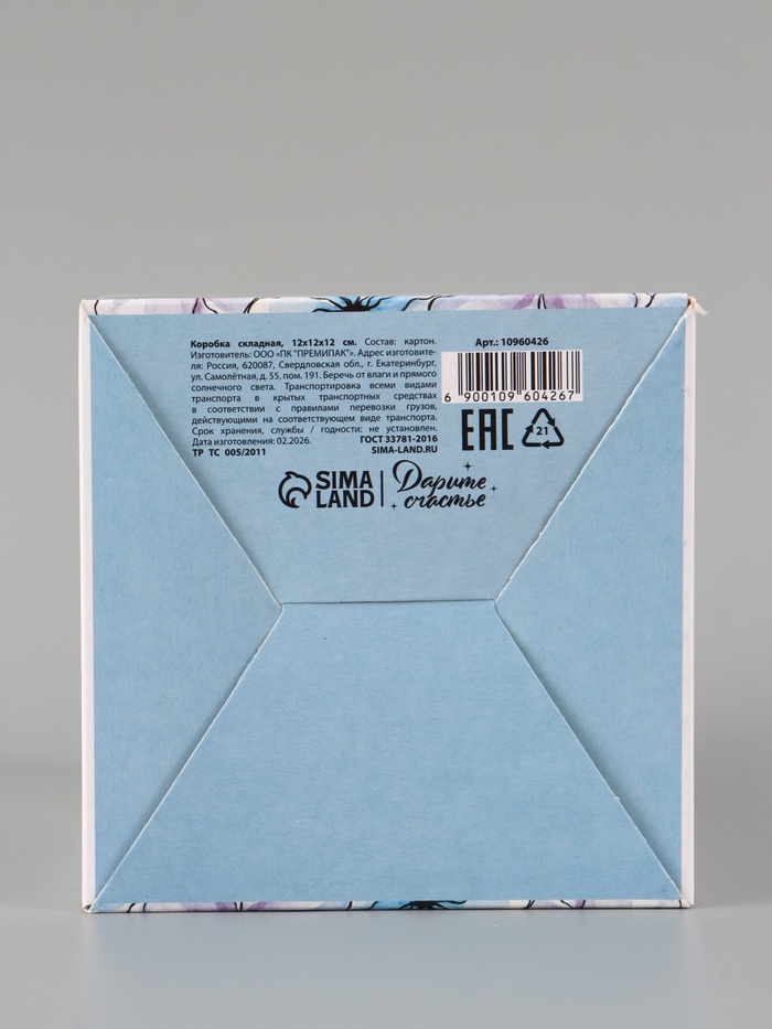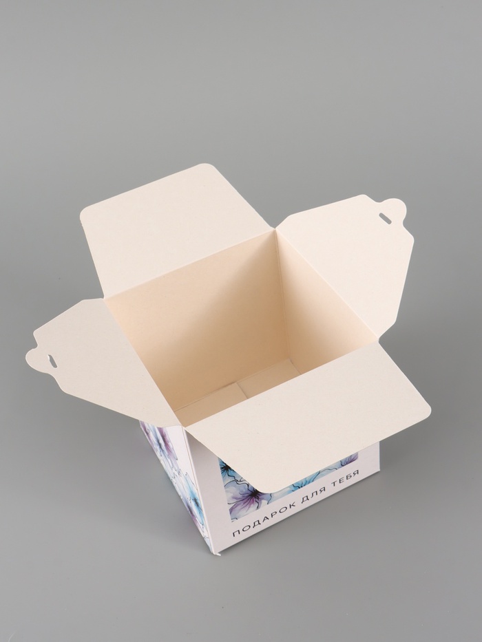 - Надёжность и форма: Плотный картон 250 г/м² сохраняет геометрию куба даже с содержимым до 350 грамм. Коробка не деформируется при транспортировке и остаётся презентабельной в момент вручения.