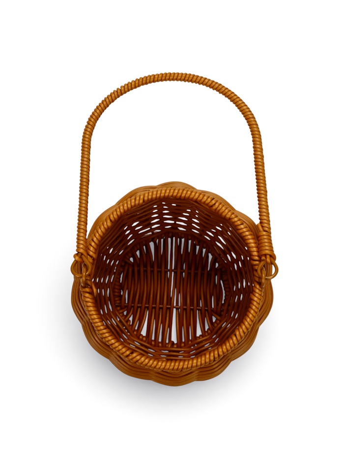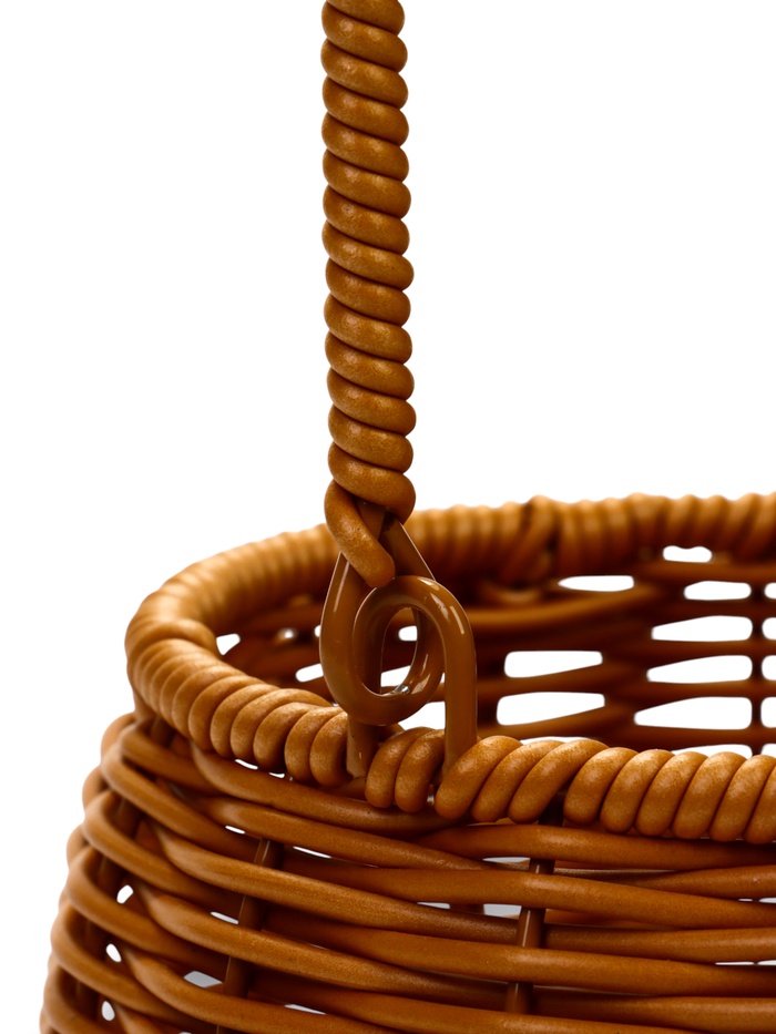 - Прочный и лёгкий пластик: материал имитирует текстуру натурального плетения, сохраняя практичность. За корзиной легко ухаживать — достаточно протереть её от пыли.