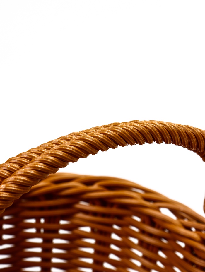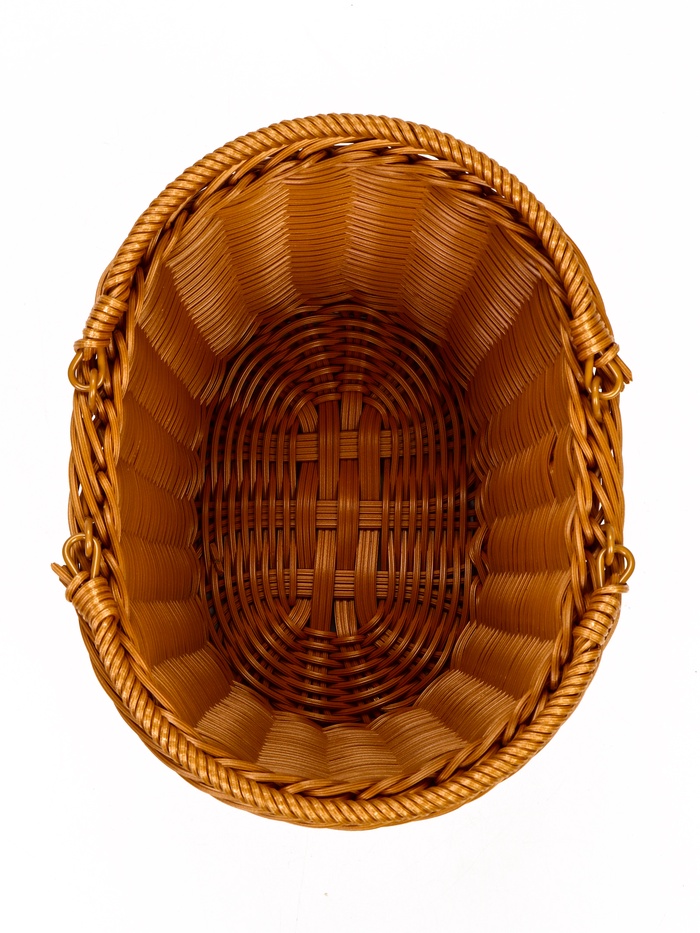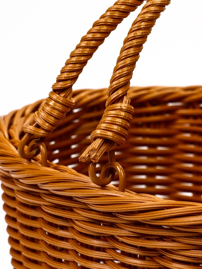 - Долговечность пластикового плетения: материал сохраняет эстетику натуральной лозы, оставаясь при этом практичным и простым в уходе. Корзину легко протирать, она устойчива к влаге и не теряет форму.