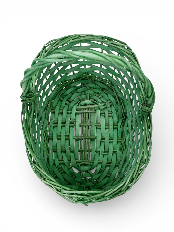 - Плотное плетение из ивы: ивовая лоза образует прочную структуру. Зелёное покрытие подчёркивает рельеф плетения, создавая игру света и тени на поверхности.
