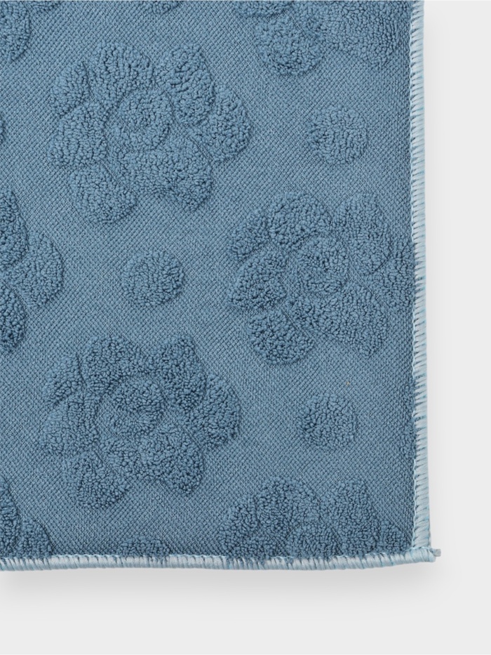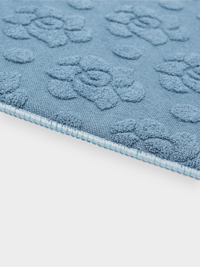 - Цветочный дизайн: Синий фон с нежными цветами делает коврик не просто утилитарным предметом, а частью декора кухни.