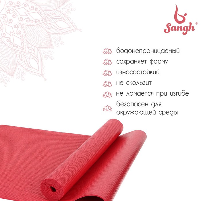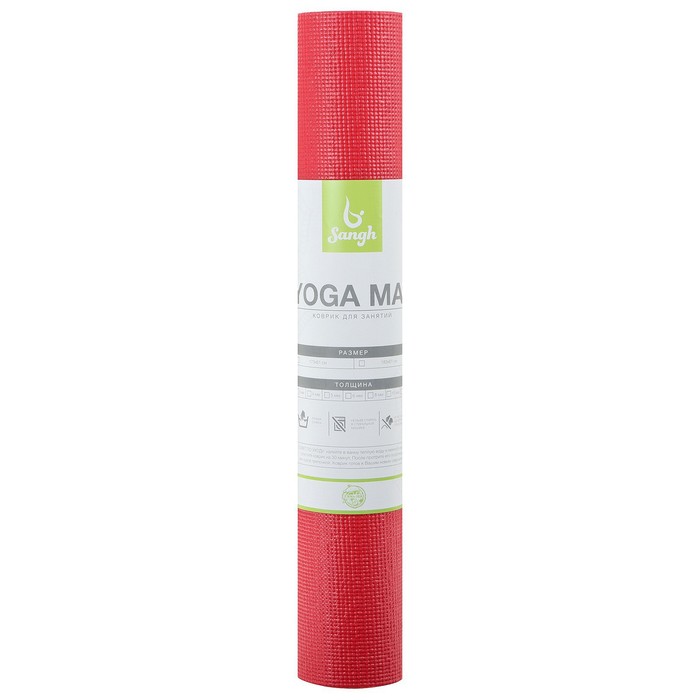 Коврик для йоги из ПВХ смягчает упор тела на твёрдую поверхность, подходит для занятий йогой и фитнесом на улице, дома и в зале. Коврик имеет мелкопористую поверхность, мягкий на ощупь и неприхотлив в уходе, а также мало весит, что позволяет легко его переносить. Сохраняет форму после выполнения упражнений.