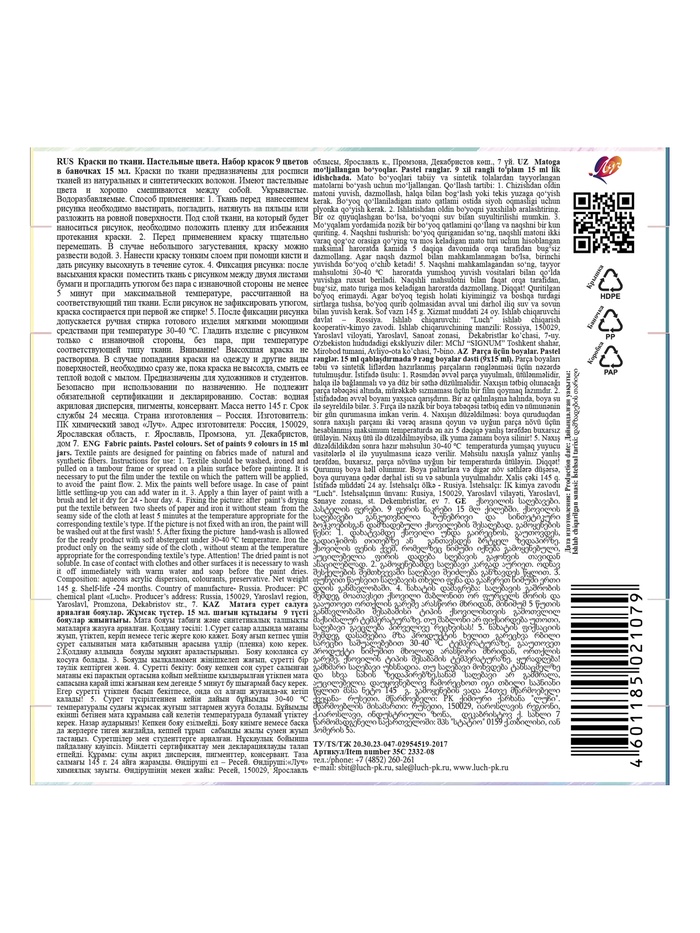 Технические характеристики Краска по ткани акрил набор 9цв*15мл Луч (пастельные цвета)