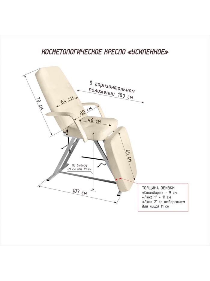 Косметологическая обивка СТАНДАРТ — обивка имеет одинаковую толщину 9 см и плотность по всей длине ложа, наполнитель специальный поролон средней жесткости. Покрытие обивки, не скользящая, высококачественная, износостойкая, «дышащая» экокожа производство Турции (50000 циклов, 100% PU полиуретан). Ширина ложа 64 см, длина 180 см. Съемные подлокотники. Косметологическое кресло «УСИЛЕННОЕ»