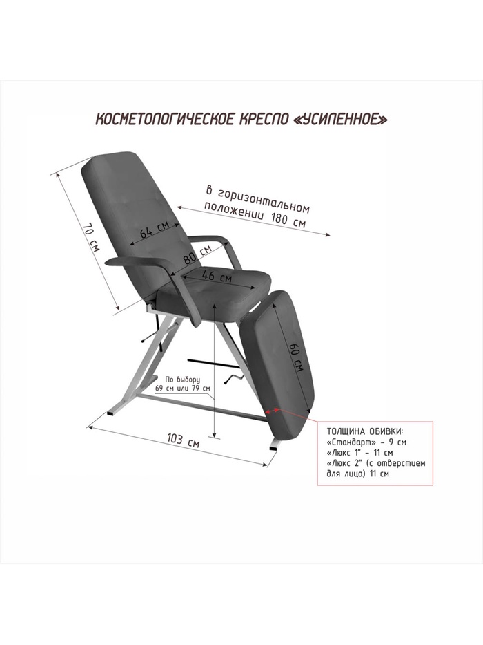 Косметологическая обивка СТАНДАРТ — обивка имеет одинаковую толщину 9 см и плотность по всей длине ложа, наполнитель специальный поролон средней жесткости. Покрытие обивки, не скользящая, высококачественная, износостойкая, «дышащая» экокожа производство Турции (50000 циклов, 100% PU полиуретан). Ширина ложа 64 см, длина 180 см. Съемные подлокотники. Косметологическое кресло «УСИЛЕННОЕ»