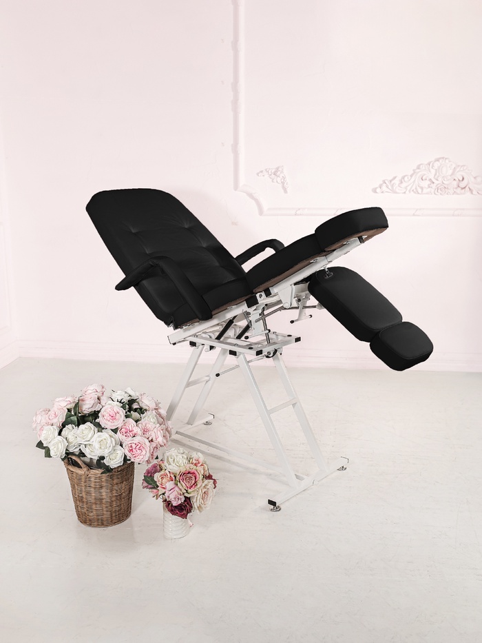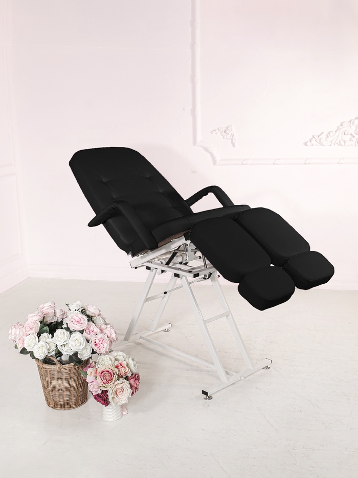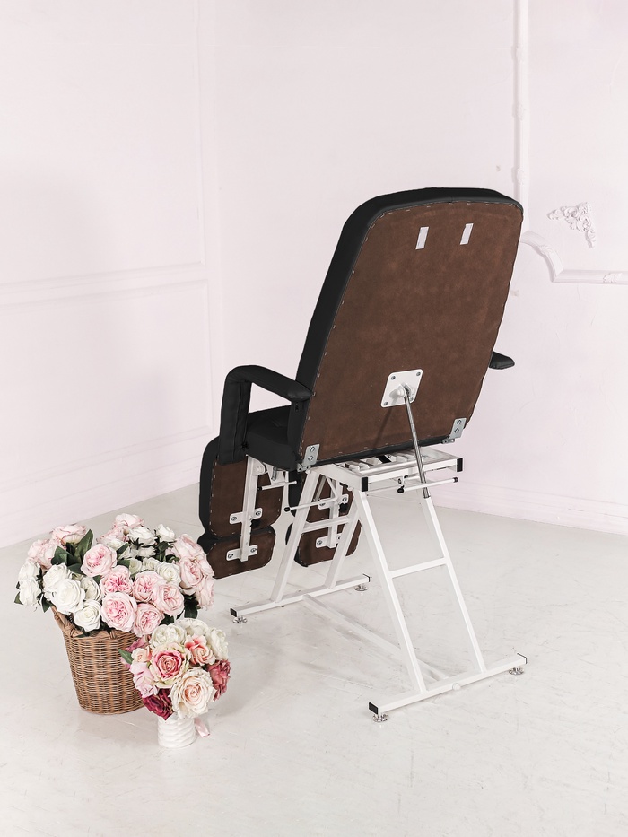 Главное преимущество модели — регулировка угла наклона сиденья. Механизм оснащён пневматическими амортизаторами, которые обеспечивают плавность движения и предотвращают резкое опускание. Мастер может заранее настроить положение кресла под формат процедуры.