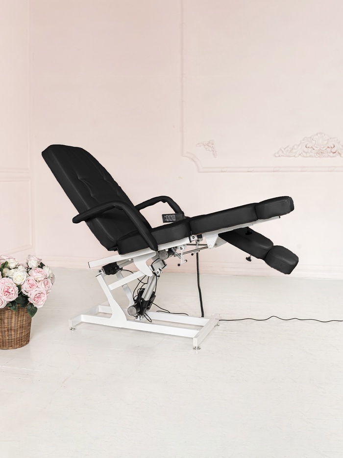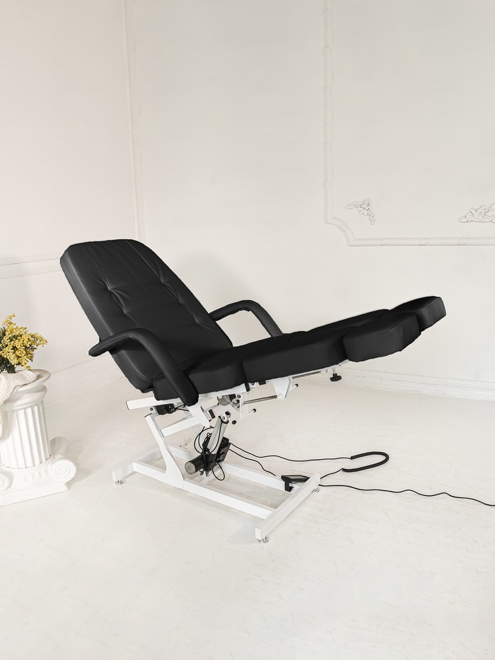 Кресло оснащено тремя электроприводами, позволяющими точно регулировать высоту, наклон спинки и подъём сиденья. Плавная настройка помогает быстро адаптировать положение под клиента и процедуру, сохраняя комфорт и правильную рабочую позу мастера.