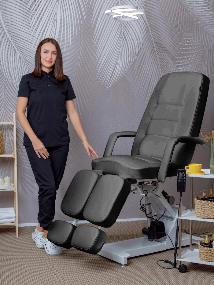 Кресло оснащено тремя электроприводами, позволяющими точно регулировать высоту, наклон спинки и подъём сиденья. Плавная настройка помогает быстро адаптировать положение под клиента и процедуру, сохраняя комфорт и правильную рабочую позу мастера.