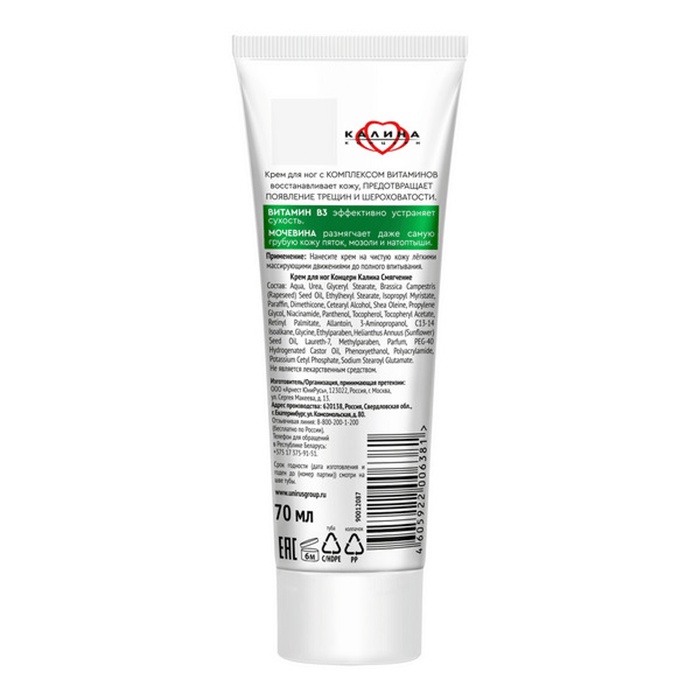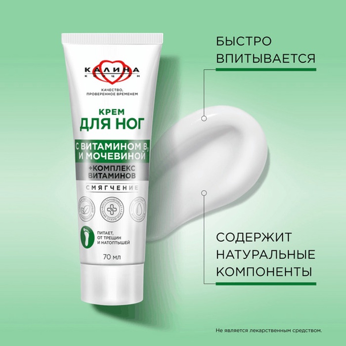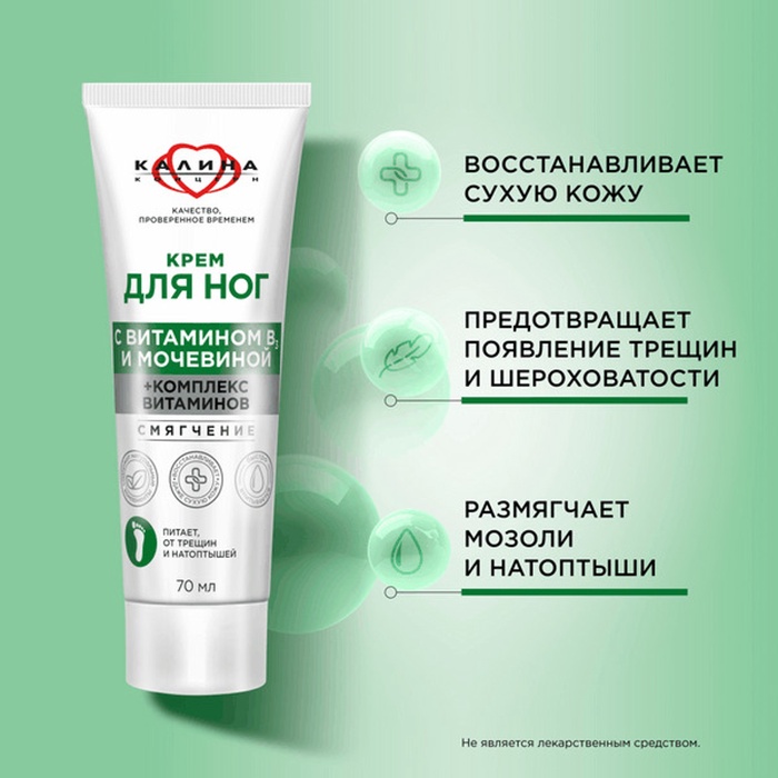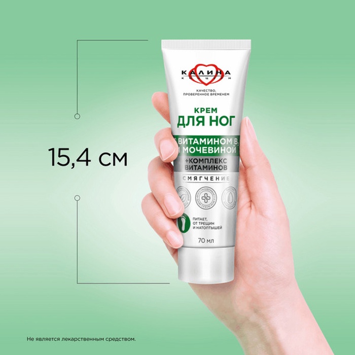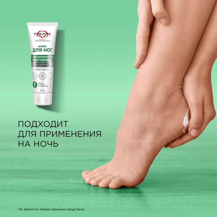 Доверьте заботу о коже ног крему с мочевиной. Комплекс витаминов в его составе восстанавливает кожу, предотвращает появление трещин и шероховатости. Так, витамин B3 эффективно устраняет сухость. Мочевина смягчает даже самую грубую кожу пяток, мозоли и натоптыши. Крем имеет приятный аромат и легко впитывается. Для наилучшего результата наносите на ночь. Не является лекарственным средством.
