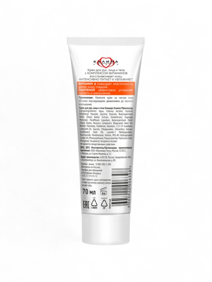 Крем для рук, лица и тела «КАЛИНА», мультиуход, с витамином А и пантенолом, 70 мл