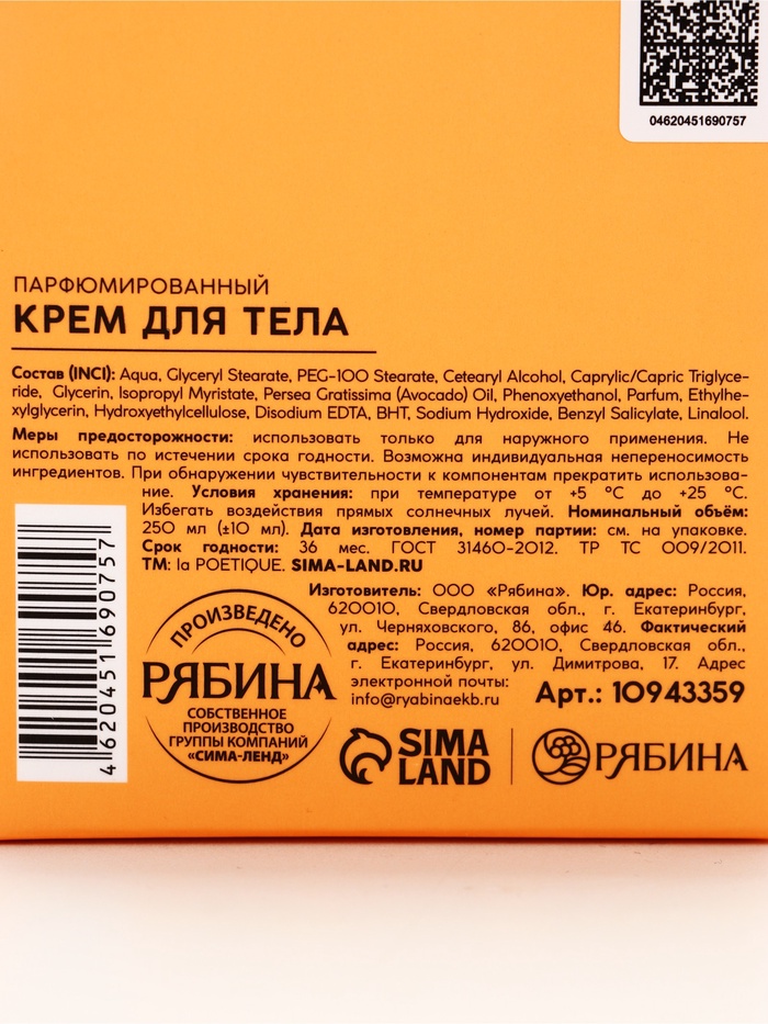 Технические характеристики Крем для тела парфюмированный, аромат «Белый мускус и цитрусовые», 250 мл, laPOETIQUE