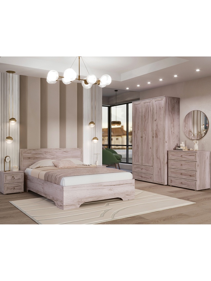 Практичное решение для спальни, выполненное в современном стиле. Оттенок дуб крафт серый придаёт интерьеру спокойный и универсальный характер.