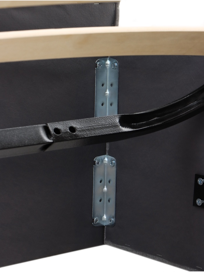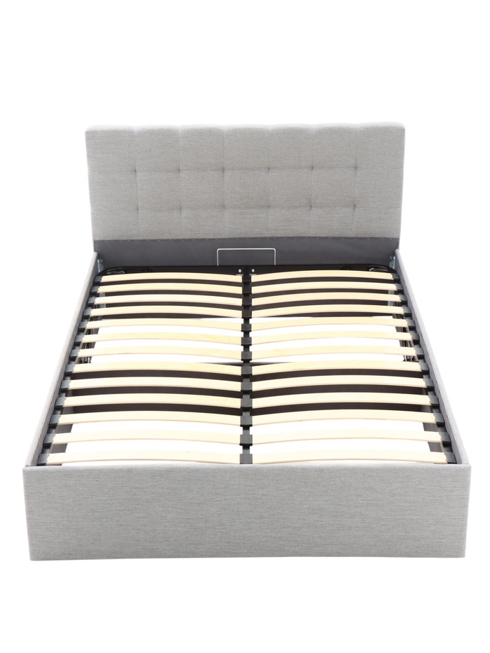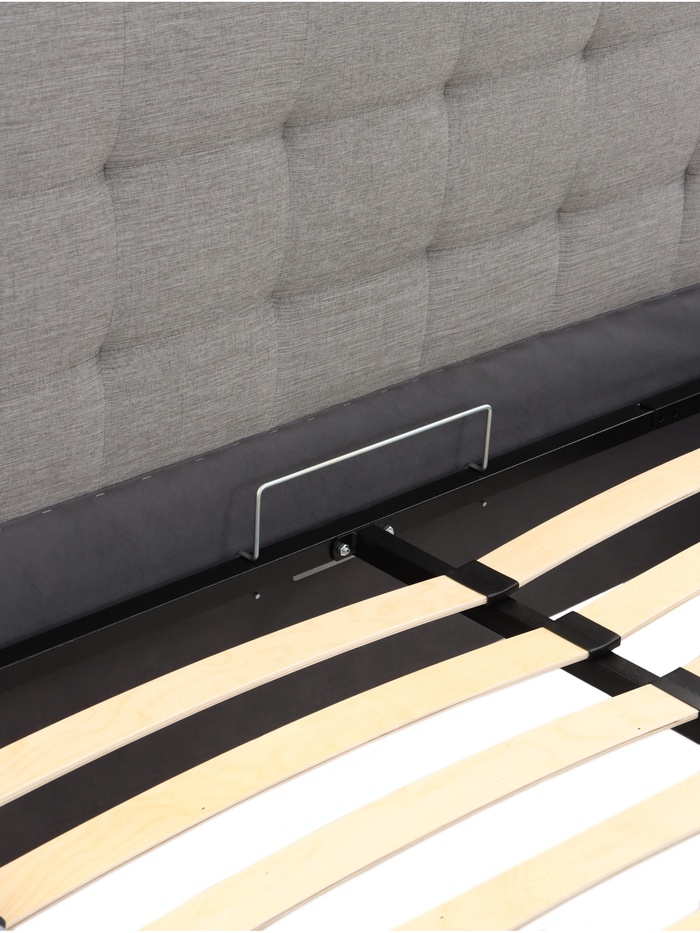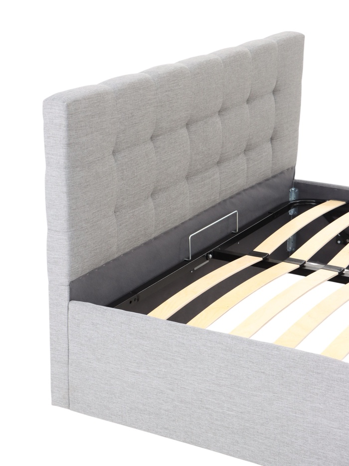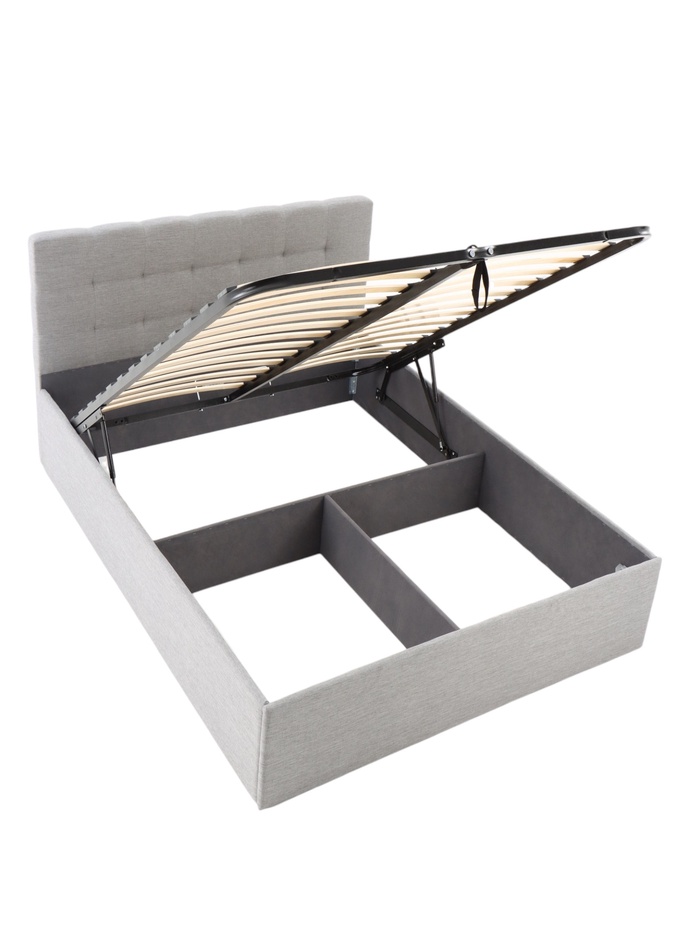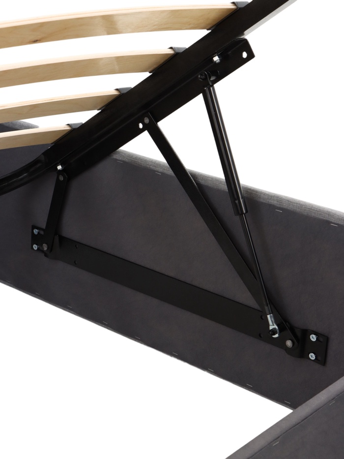 Подъёмный механизм облегчает доступ к внутреннему месту хранения, что удобно для размещения постельных принадлежностей, пледов и сезонных вещей. Основание под матрас предусмотрено, а деревянные ламели поддерживают матрас во время эксплуатации.
