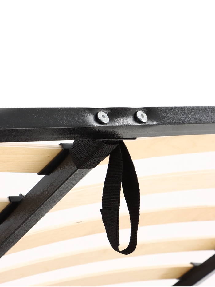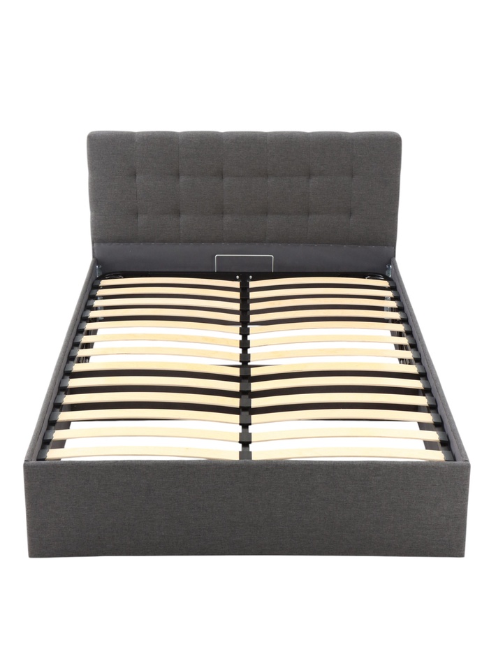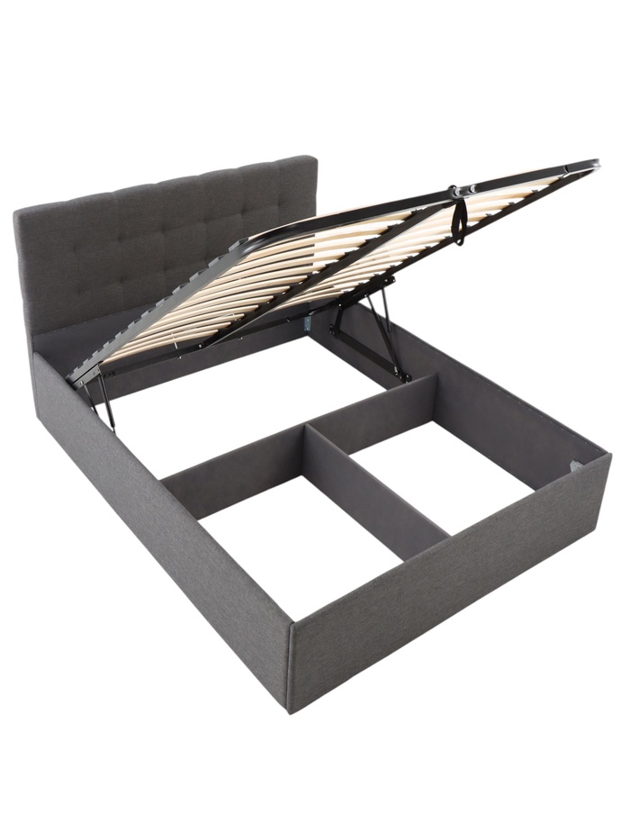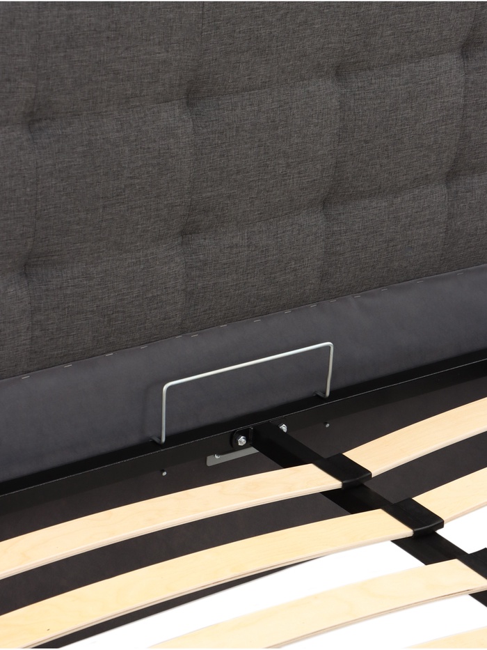 Подъёмный механизм облегчает доступ к внутреннему месту хранения, что удобно для размещения постельных принадлежностей, пледов и сезонных вещей. Основание под матрас предусмотрено, а деревянные ламели обеспечивают поддержку матраса во время эксплуатации.