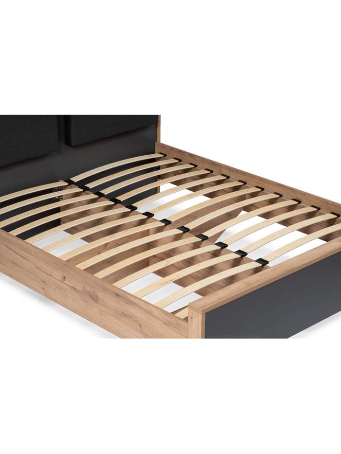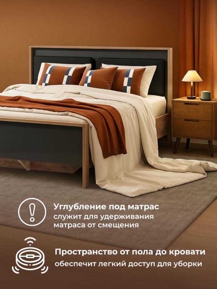 Просторное спальное место 180×200 см обеспечивает максимальный комфорт для двоих. Ортопедическое основание с деревянными ламелями способствует правильной поддержке матраса и равномерному распределению нагрузки, создавая условия для полноценного отдыха и здорового сна.