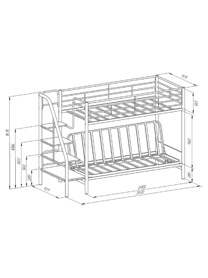 Технические характеристики Кровать двухъярусная с диваном "Мадлен -3" серый/ткань Серая