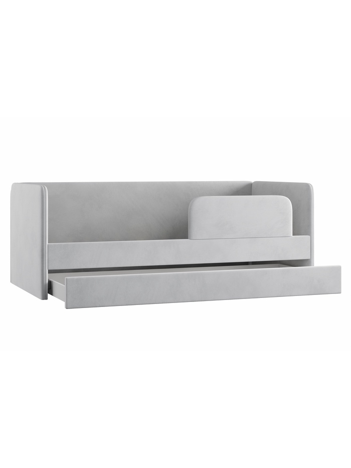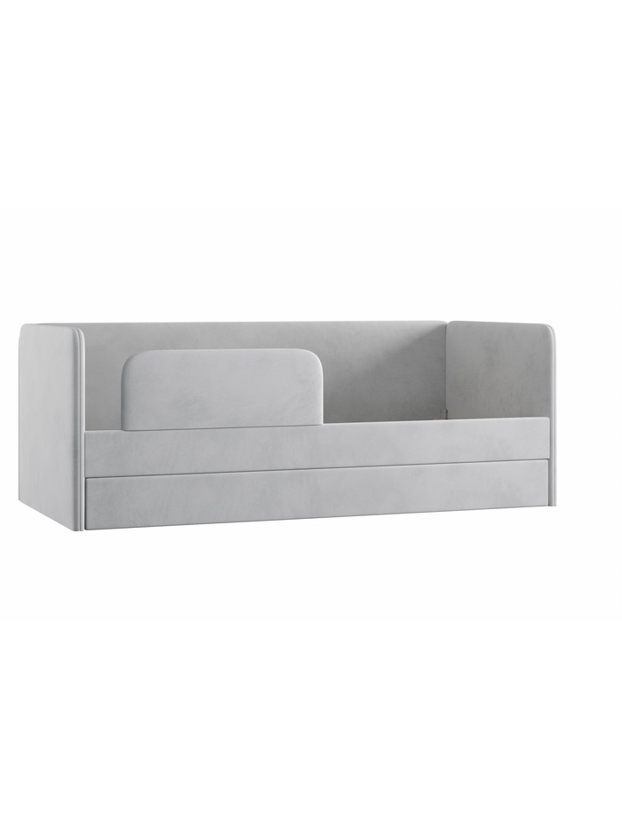 Универсальное и функциональное решение для детской комнаты. Кровать-тахта выполнена в благородном сером оттенке с мягкой велюровой обивкой, которая придаёт мебели комфорт, уют и тактильную приятность. Модель оснащена дополнительным спальным местом, что делает её идеальным выбором для размещения двух детей или для организации гостевой зоны.