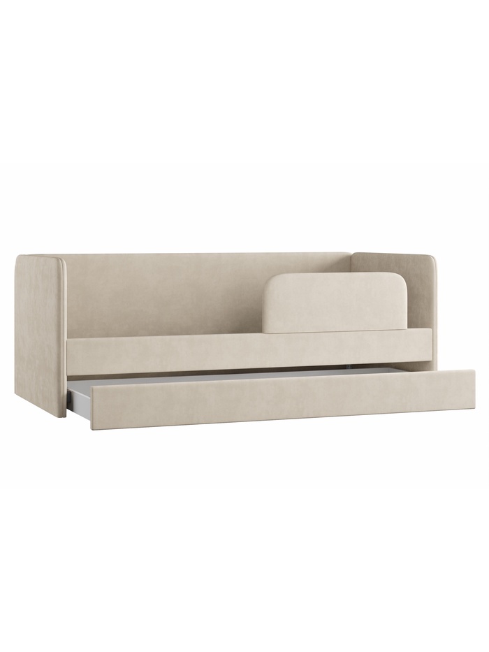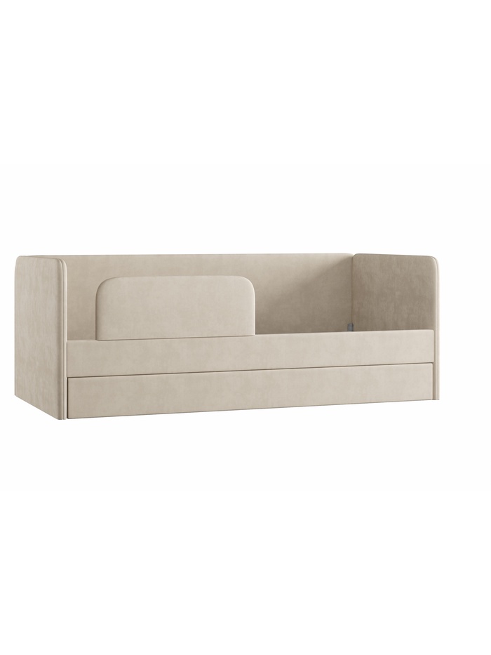 Функциональное и стильное решение для детской комнаты. Кровать-тахта выполнена в уютном бежевом оттенке с мягкой велюровой обивкой, которая придаёт мебели комфорт, уют и тактильную приятность. Модель оснащена дополнительным спальным местом, что делает её идеальным выбором для размещения двух детей или для организации гостевой зоны.