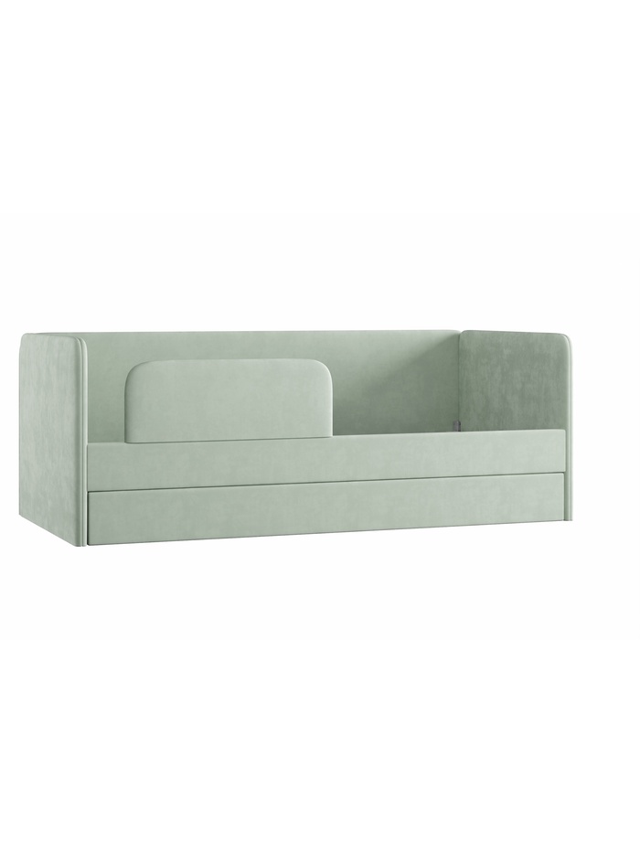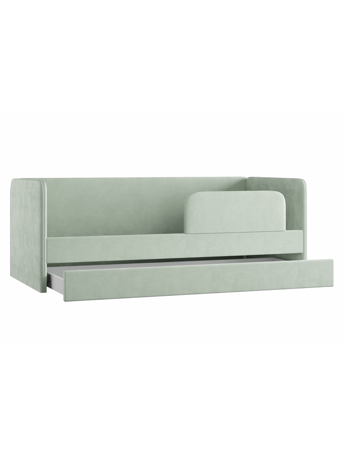 Стильное и функциональное решение для детской комнаты. Кровать-тахта выполнена в благородном оливковом оттенке с мягкой велюровой обивкой, которая придаёт мебели комфорт, уют и тактильную приятность. Модель оснащена дополнительным спальным местом, что делает её идеальным выбором для размещения двух детей или для организации гостевой зоны.