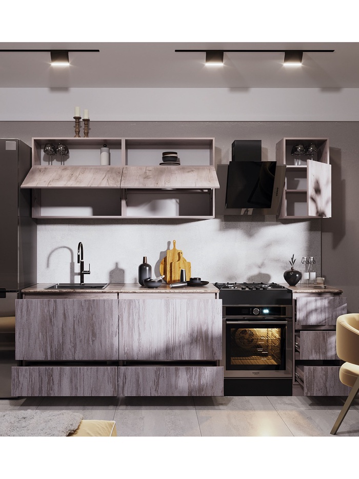 Элегантное и функциональное решение для современной кухни. Гарнитур выполнен в благородном оттенке артвуд тёмный с выразительной текстурой, которая привносит в интерьер глубину, природную гармонию и стильный характер.