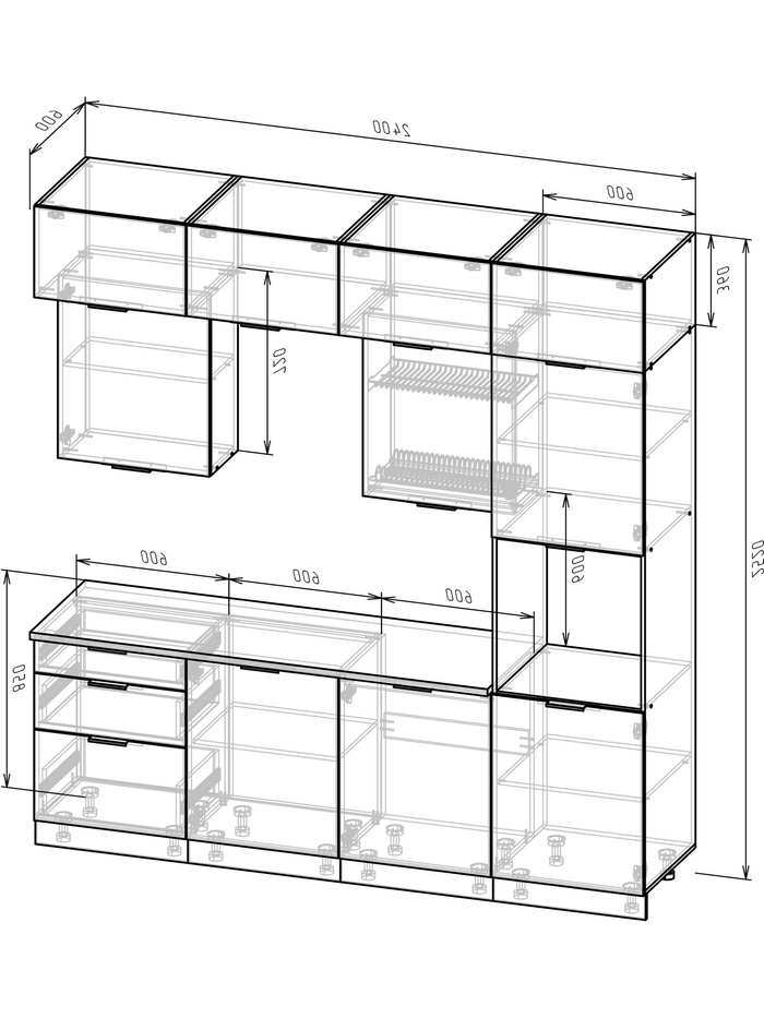 Представляет собой трёхуровневый комплект для установки вдоль стены с высотой до потолка. Конструкция позволяет адаптировать гарнитур под планировку помещения, создавая функциональную рабочую зону с местом для хранения и бытовой техники.