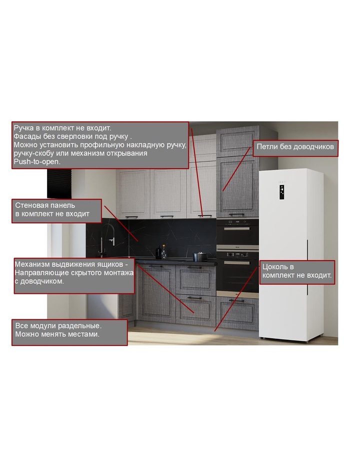 - Модульная конструкция: все элементы раздельные — можно менять местами под планировку кухни.