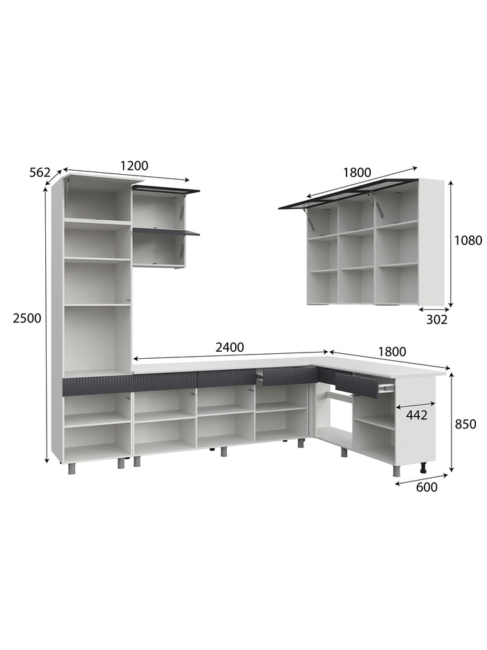 Технические характеристики Кухонный гарнитур угловой до потолка «София», 3000×1800 мм, цвет белый/графит МДФ