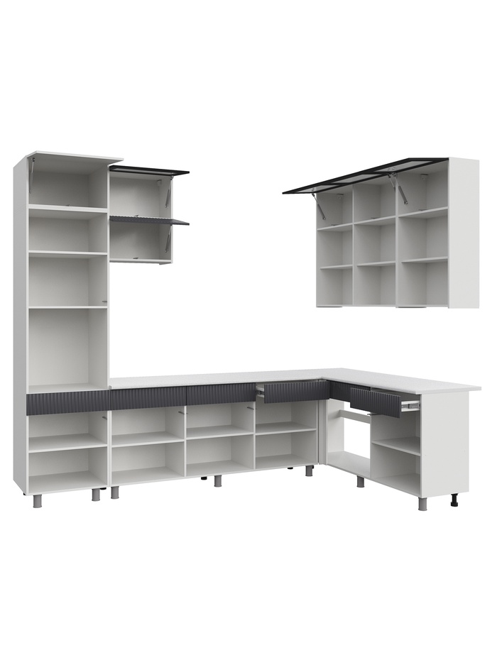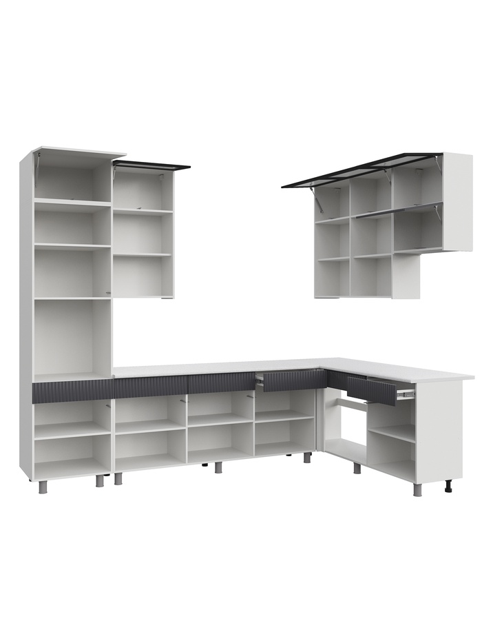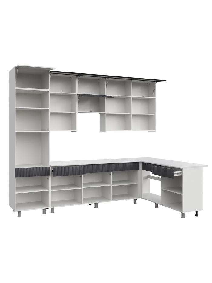 Функциональное и стильное решение для современной кухни. Угловая конфигурация и конструкция до потолка обеспечивают максимум полезного пространства и удобство в повседневной эксплуатации. Продуманная компоновка модулей формирует эргономичную рабочую зону, где всё необходимое находится под рукой. Такое решение особенно удобно для тех, кто часто готовит: рабочие поверхности, зоны хранения и техника выстроены в логичную и комфортную систему.