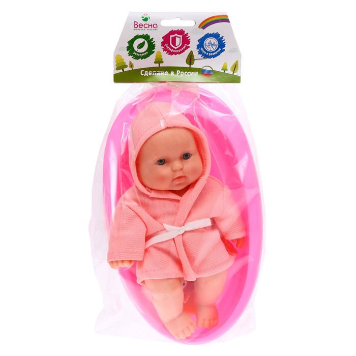 Набор «Карапуз – мальчик в ванночке» сделает сюжетно-ролевую игру «Дочки-матери» более увлекательной и интересной. В него входит: пупс с рельефной головой, ванна 22,5 х 15 х 5,5 см, игрушка-утёнок, коврик, губка и банный халатик. Игрушка отечественного производства изготовлена из безопасного нетоксичного пластика и ПВХ. Малыша можно купать, как настоящего ребенка. После принятия водных процедур, маленькая мама споет своему сыночку колыбельную песенку и уложит его спать.