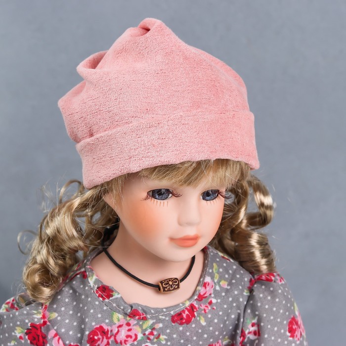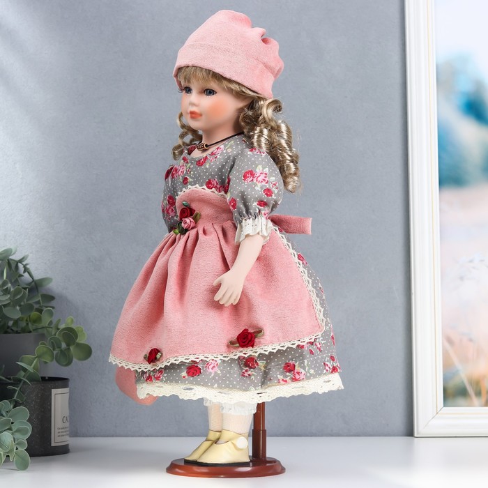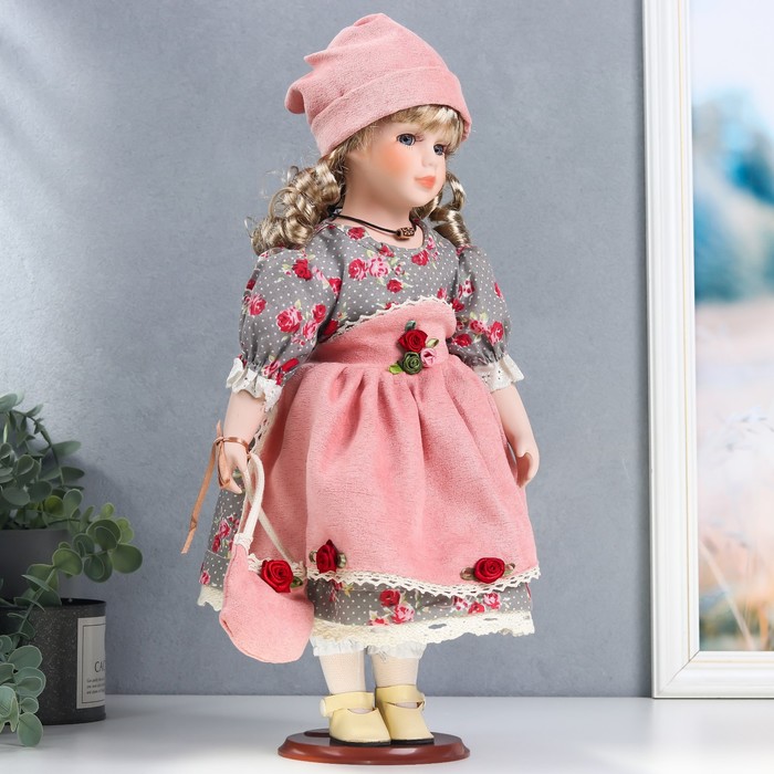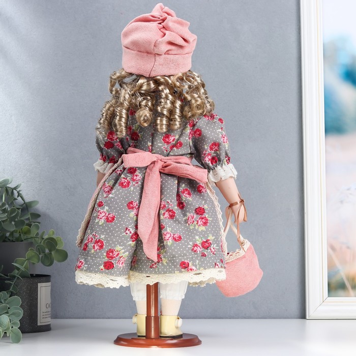 Технические характеристики Кукла коллекционная керамика "Кристина в розово-сером платье с цветами, с сумкой" 40 см