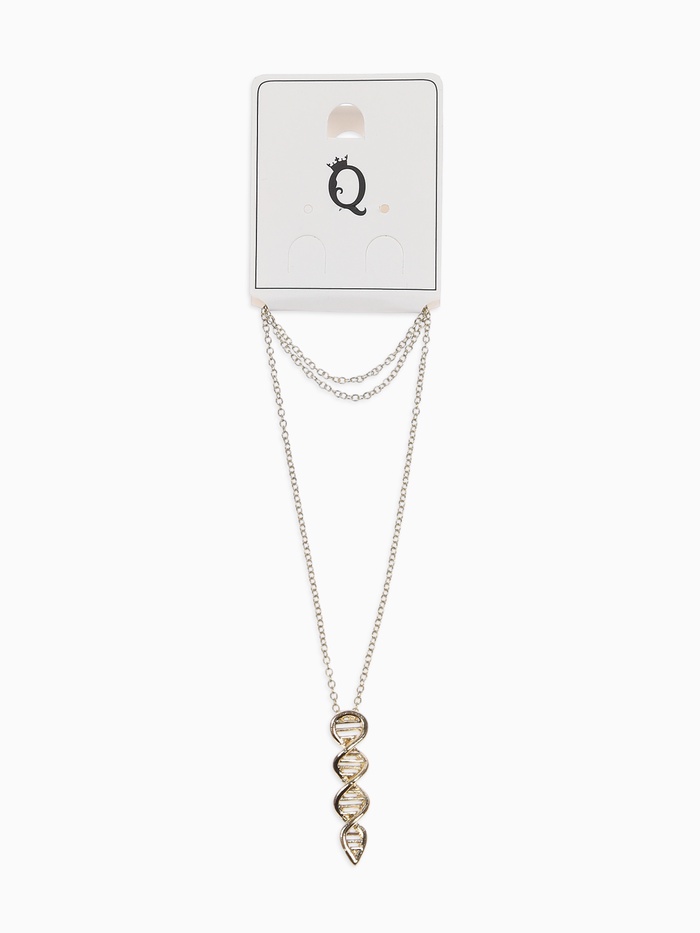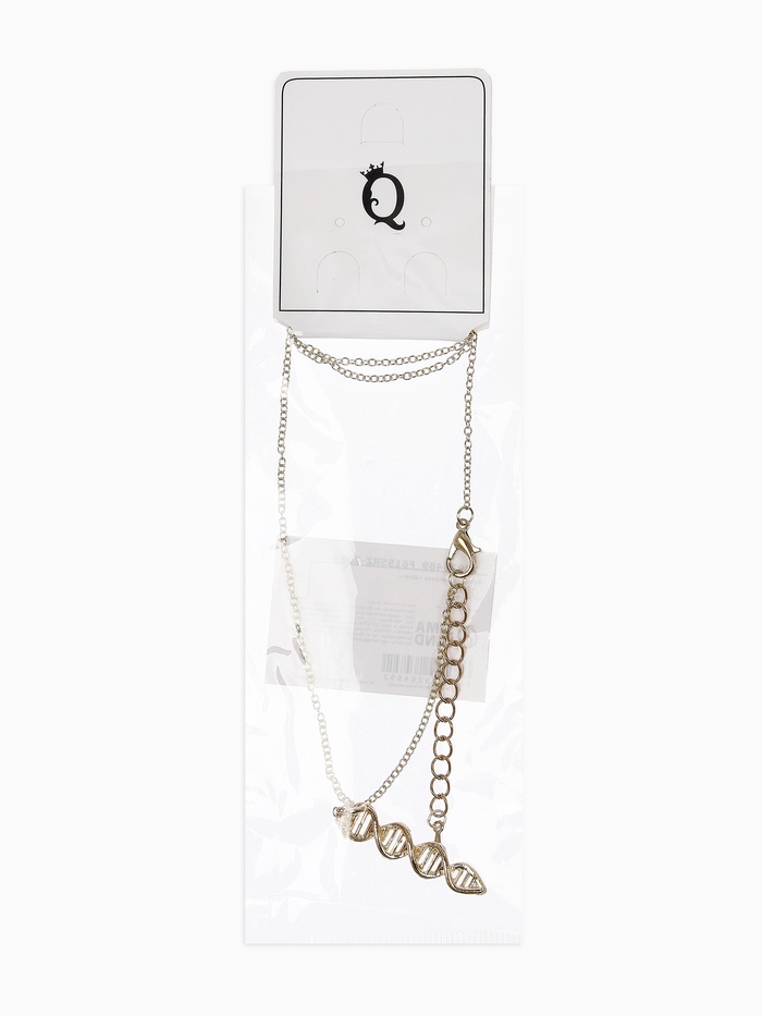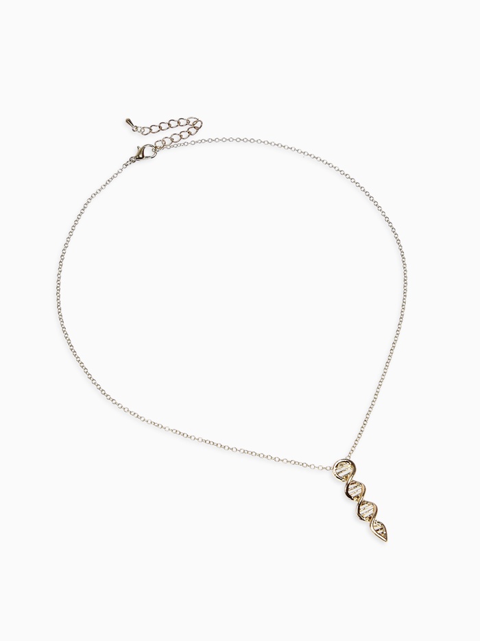 Особенность украшения заключается в тонкой металлической цепи, завершающейся символическим подвесом — миниатюрной молекулой ДНК, выполненной в золотом оттенке. Созданное из высокопрочного металла, изделие отличается долговечностью и износостойкостью, сохраняя первоначальный внешний вид долгие годы.