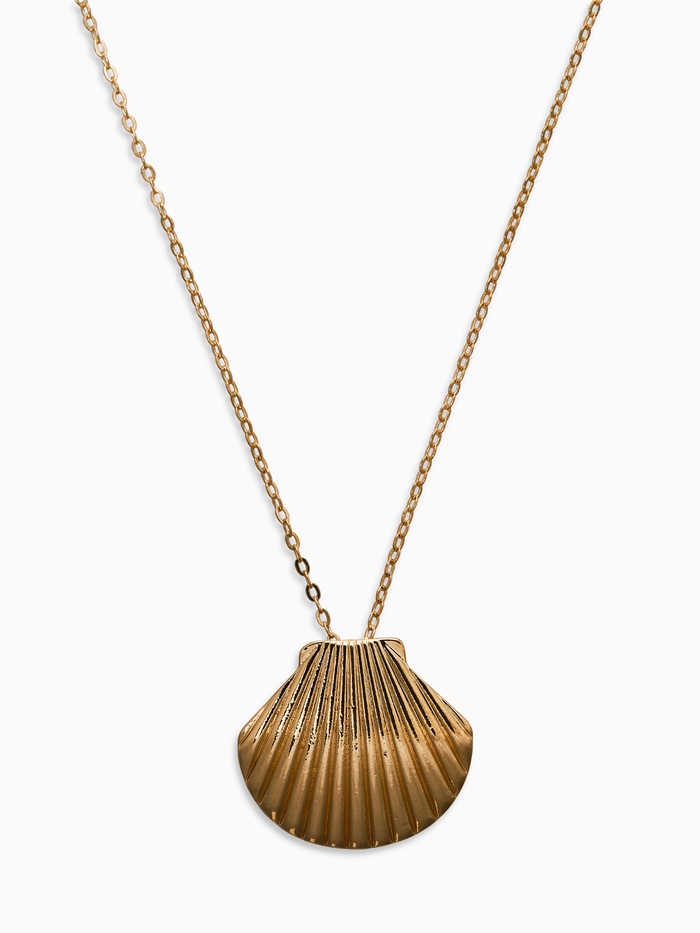 Основа кулона изготовлена из первоклассного металла, покрытого глянцевым золотистым напылением, что придает изделию живой блеск и очарование солнца на закате. Ракушка расположена на изящной цепи длиной ровно 50 см, повторяя очертания классической морской раковины, внутри которой будто скрываются сокровища океанских глубин.