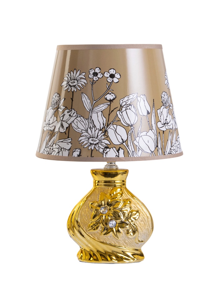 Интерьерные возможности: Лампа создает мягкое фоновое освещение для спален, гостиных и кабинетов. Золотой акцент гармонично вписывается в классические интерьеры, ар-деко и современные стили с винтажными элементами. Светильник продается без лампы в комплекте — это возможность выбрать подходящий источник света для создания желаемой атмосферы. Идеальное решение для тех, кто ценит благородные цветовые сочетания и традиционные формы в освещении.