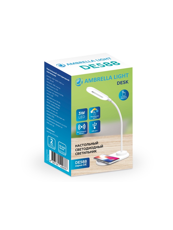 Технические характеристики Лампа настольная DE588, LED, 3Вт, 3000-6400K, беспроводная зарядка, 16х8,5х28 см, белый