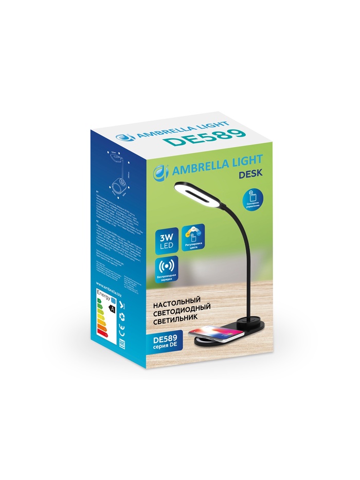 Технические характеристики Лампа настольная DE589, LED, 3Вт, 3000-6400K, беспроводная зарядка, 16х8,5х28 см, чёрный
