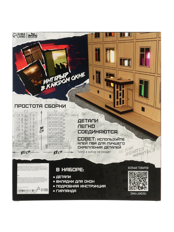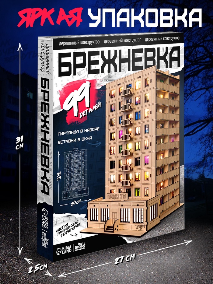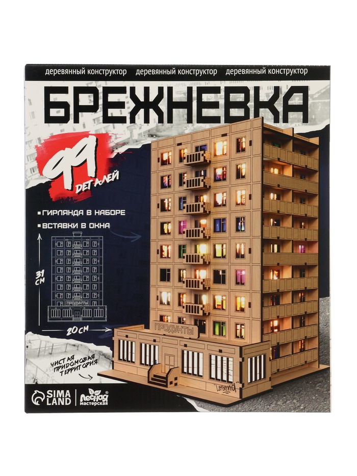 Деревянный конструктор «Брежневка» — это сборная 3D-модель советского многоквартирного дома для детей от 5 лет и взрослых, ценящих ретро-стилистику и творчество. В процессе сборки из 99 деталей получается компактный домик, который можно раскрасить красками, превратив в уникальный элемент интерьера или ночного уюта.
