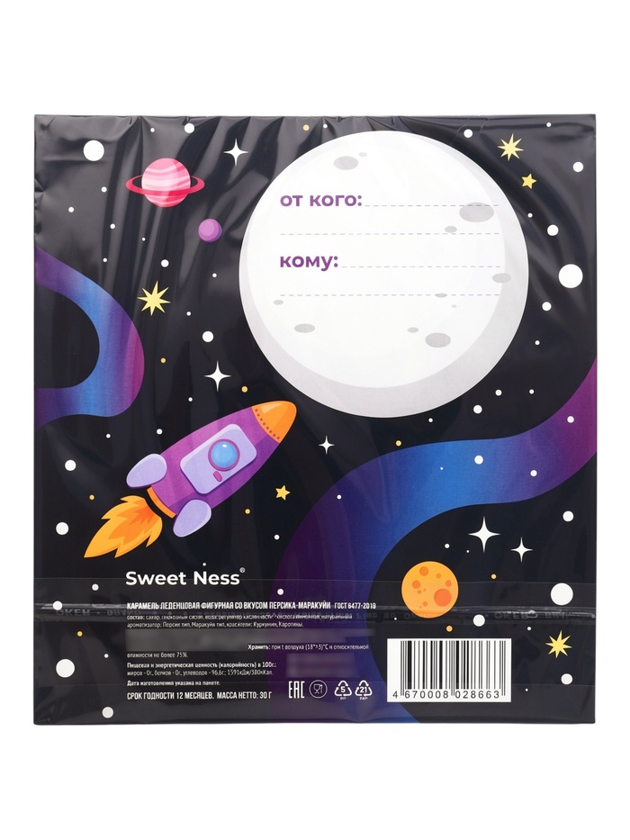 Сладкая открытка-леденец с экзотическим вкусом — это два подарка в одном. Фигурный диск из карамели на палочке сочетает в себе роль яркого поздравления и лакомства со вкусом солнечного персика и тропической маракуйи.