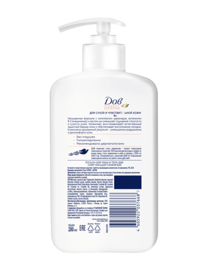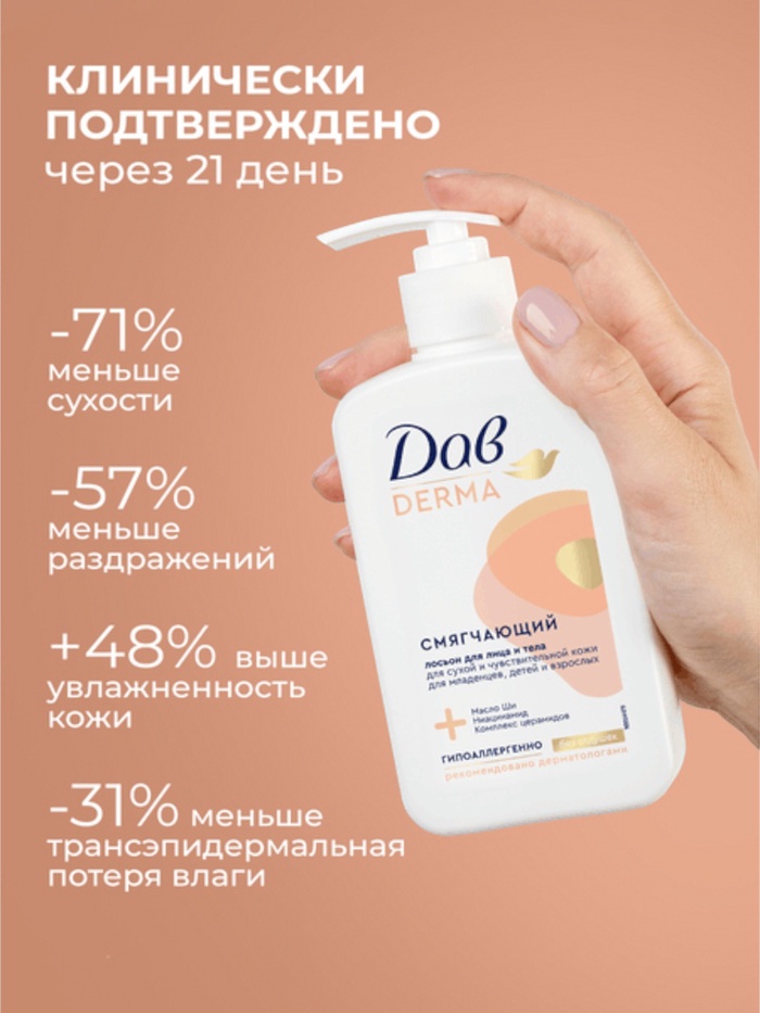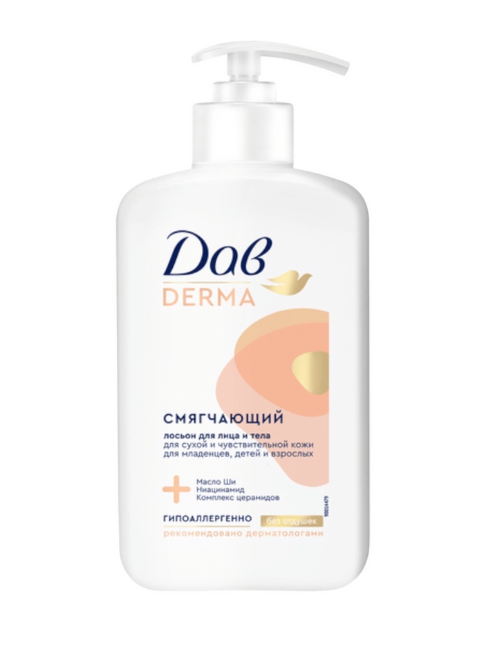 Смягчающий лосьон для лица и тела Дав Derma — это средство для ежедневного ухода за сухой и чувствительной кожей.