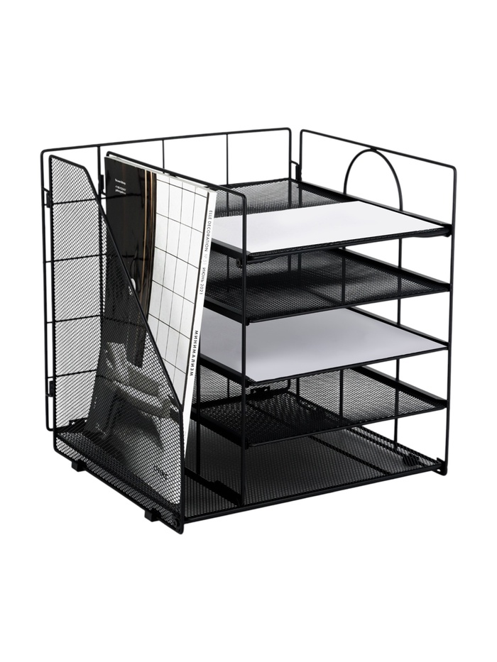 Органайзер для документов с 5 отделениями комбинирует горизонтальное и вертикальное хранение бумаг, помогая поддерживать порядок на рабочем столе. Металлическая сетка обеспечивает лёгкий доступ к документам и надёжность конструкции, создавая функциональное пространство для офисных или учебных материалов.