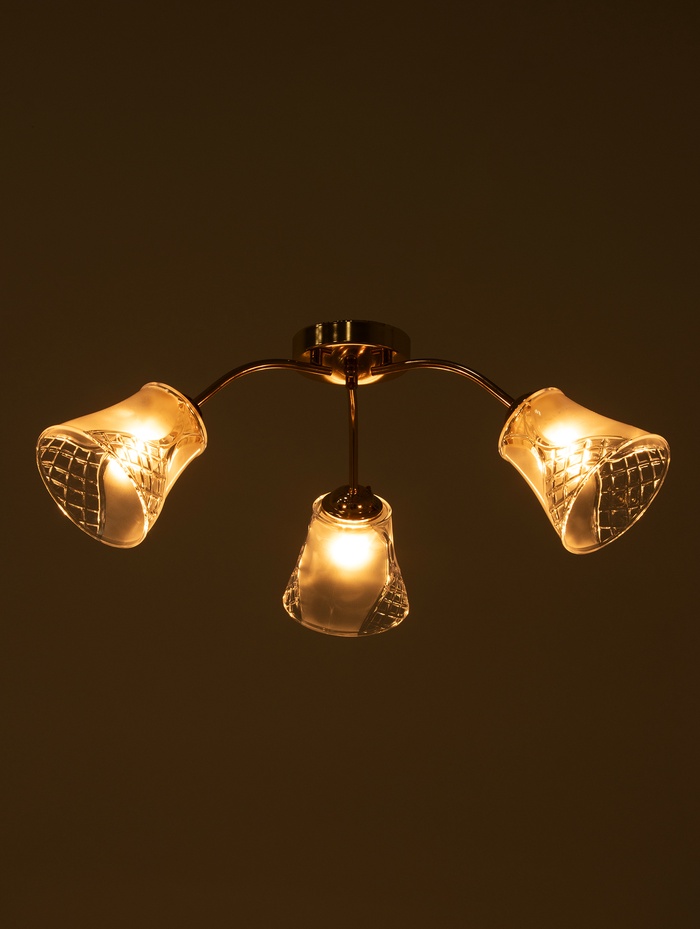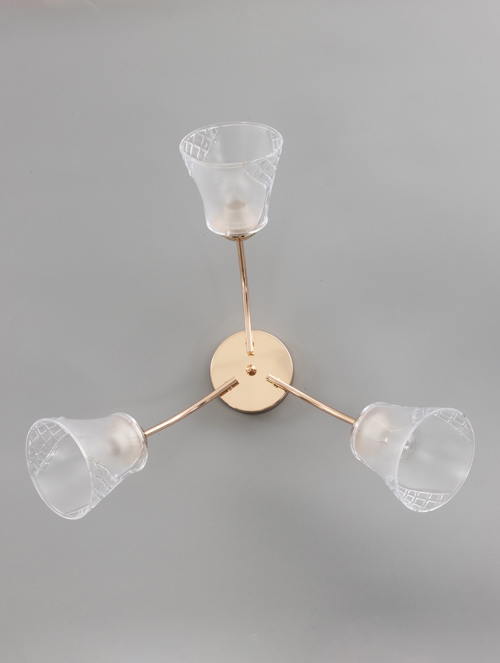 Люстра с характером для современного интерьера! Трёхрожковая люстра на штанге — это сочетание лаконичной геометрии и тёплого золотого акцента. Прозрачные трапециевидные плафоны на металлическом каркасе создают ровное, направленное вниз освещение, идеально подходящее для гостиной или спальни.