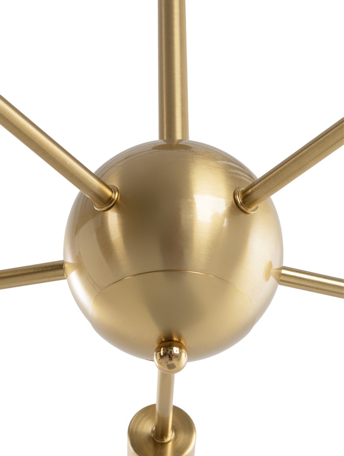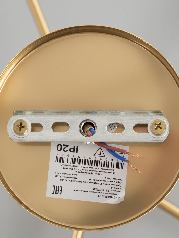 - Прочный металлический каркас: Основание из металла с золотым покрытием гарантирует долговечность и стабильность конструкции. Штанговая подвеска надежно фиксирует люстру на потолке.