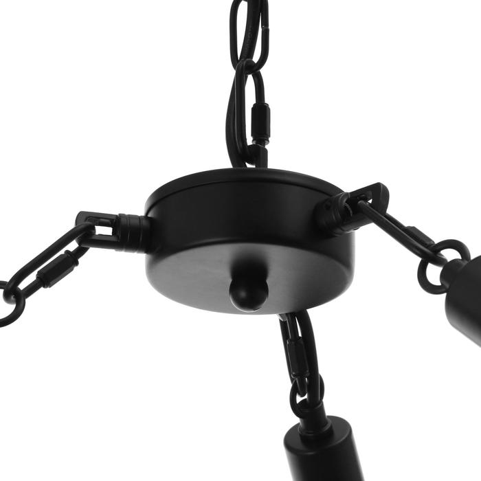 - Чистый лофт без лишнего: Чёрное основание из металла и текстиля, массивная цепь и строгие конусные плафоны тёмных тонов подчёркивают индустриальную эстетику. Внутренняя поверхность отражает свет вниз, создавая чёткие зоны освещения без рассеивания по потолку.