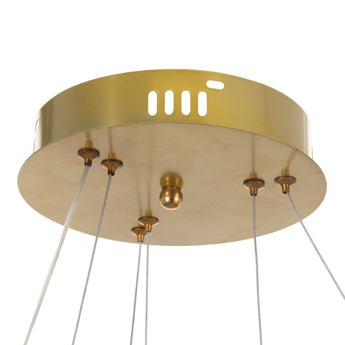 Свет, заключённый в золотое кольцо Подвесной LED-светильник с пультом ДУ, 140 Вт, регулировкой цветовой температуры (3000–6000 К), золотистый, 60 см — дизайнерское решение для тех, кто хочет, чтобы освещение стало центром внимания. Его форма в виде кольца с внутренним шарообразным рассеивателем создаёт эффект парящего света.